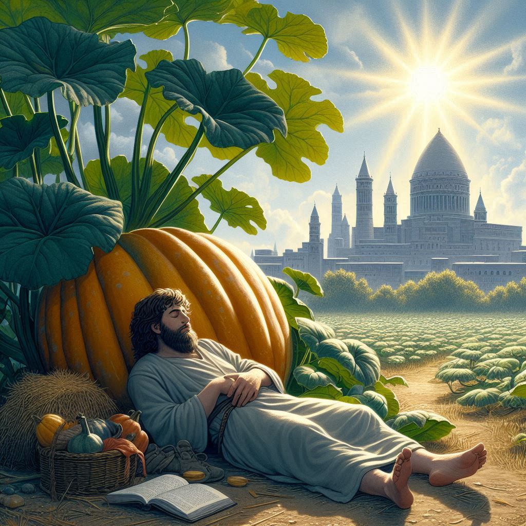 Mas a história não termina aí. Jonas ficou descontente com a misericórdia de Deus para com Nínive. Ele se sentou do lado de fora da cidade, esperando para ver o que aconteceria. Deus providenciou uma planta (alguns traduzem como abobeira) para crescer rapidamente e dar sombra a Jonas. Jonas ficou muito feliz com a planta.